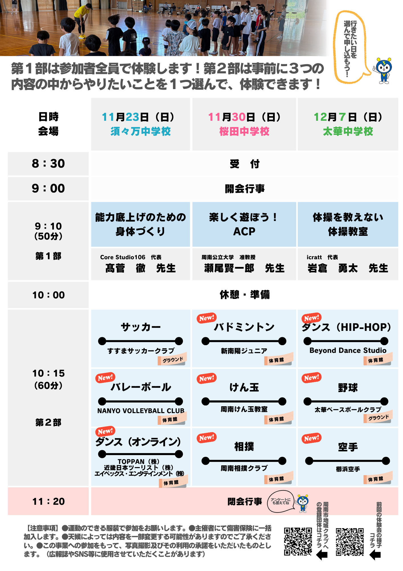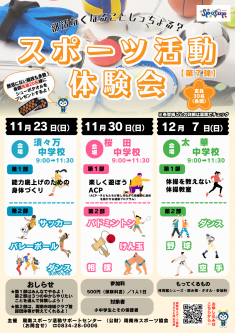 | 12月7日(日) 9時00分~11時30分 | 太華中学校 | 体操を教えない体操教室 トレーニングスタジオicratt 岩倉 勇太 先生 | 野球 (太華ベースボール) | 空手 (櫛浜空手) | ダンス 【HIP-HOP】 | |