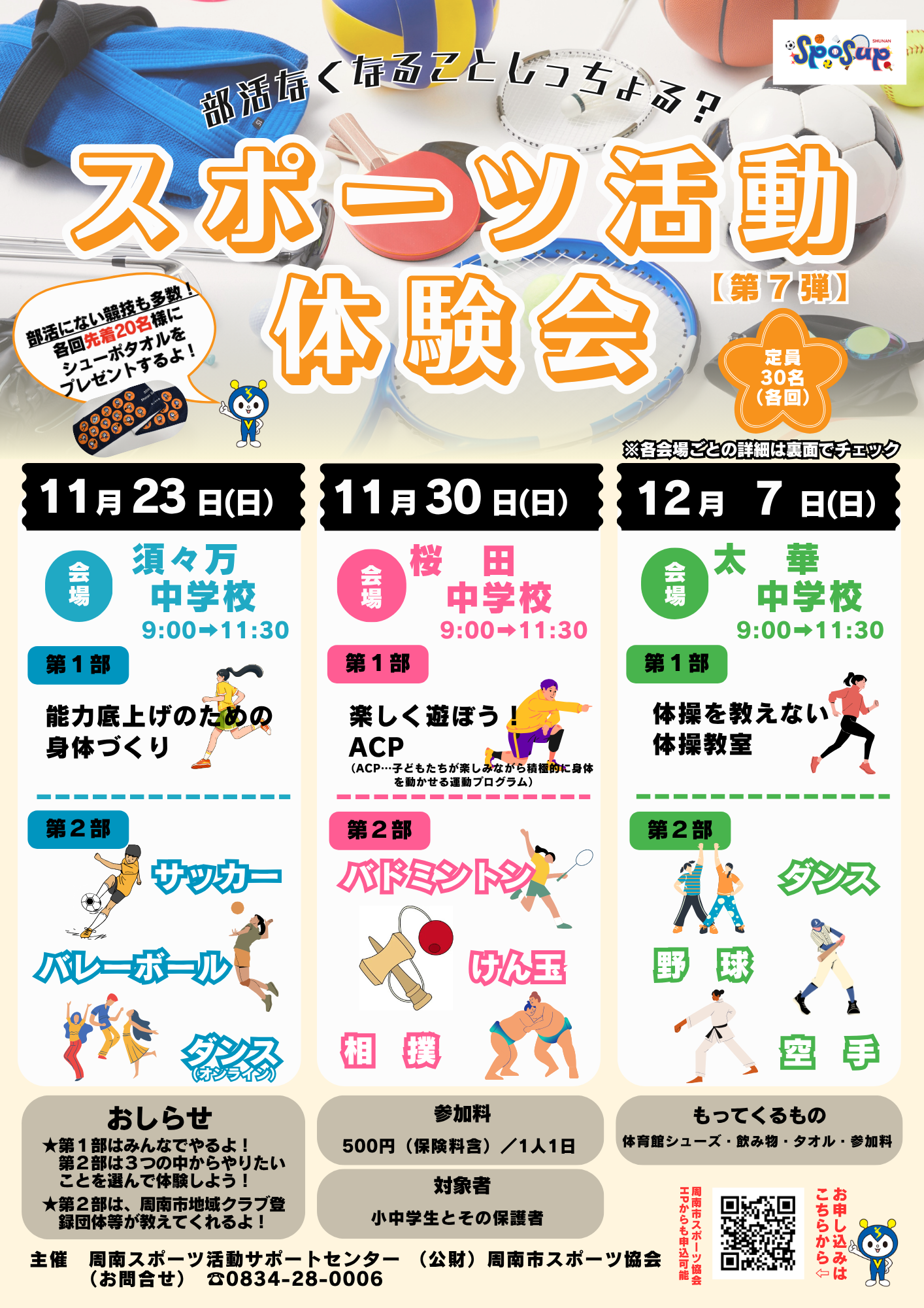 | 11月30日(日) 9時00分~11時30分 | 桜田中学校 | 楽しく遊ぼう!ACP※2 周南公立大学准教授 瀬尾 賢一郎 先生 | バドミントン (新南陽ジュニア) | けん玉 (周南けん玉教室) | 相撲 (周南相撲クラブ) | |