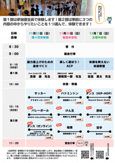 今回は3つの会場で計3回それぞれ基礎体力作りのための運動体験(第1部)とやりたいことを自ら選んで体験していただくスポーツ活動体験(第2部)をご用意しています!~部活なくなることしっちょる?~